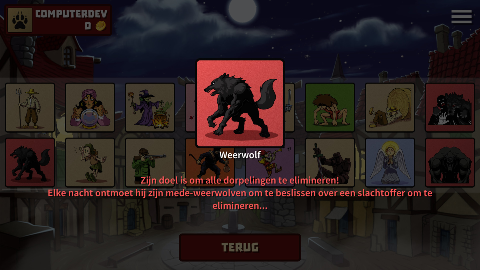 Weerwolf is een rollenspel- en strategiespel waarin je een dorpeling, een weerwolf of een speciale rol speelt. Bluf, logica en sluipvaardigheid zijn je beste wapens om te overleven... of anderen uit te schakelen.
