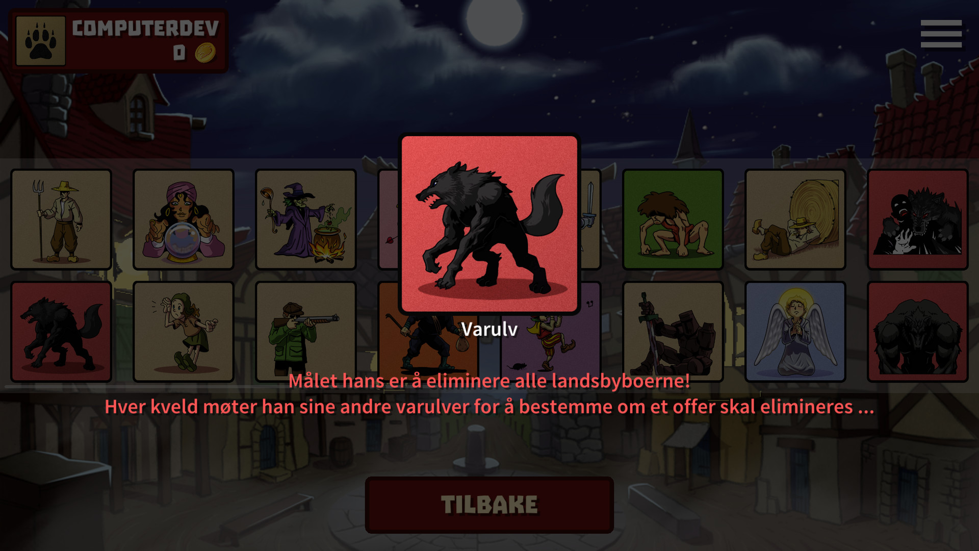 Varulv er et rollespill og strategispill hvor du spiller en rolle som kan være en landsbyboer, en varulv eller en spesialrolle. Bløff, logikk og sniking vil være dine beste våpen for å overleve ... eller eliminere andre.