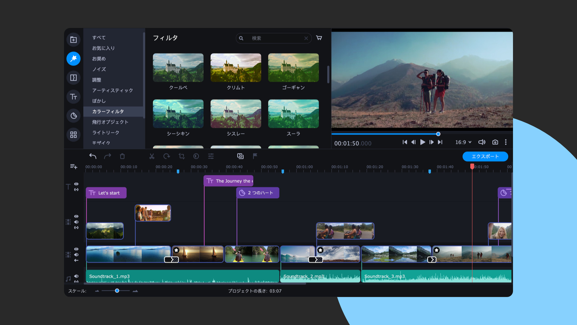 あなたの創造力を活かして、今まで以上に魅力的なブイログを作成しましょう。そのために必要なものはすべて揃っています。便利なマルチトラックのタイムラインで映像を管理できますし、大容量のファイルについて心配する必要もありません。このプログラムはフル HD 動画や 4K 動画の作業にも最適です。