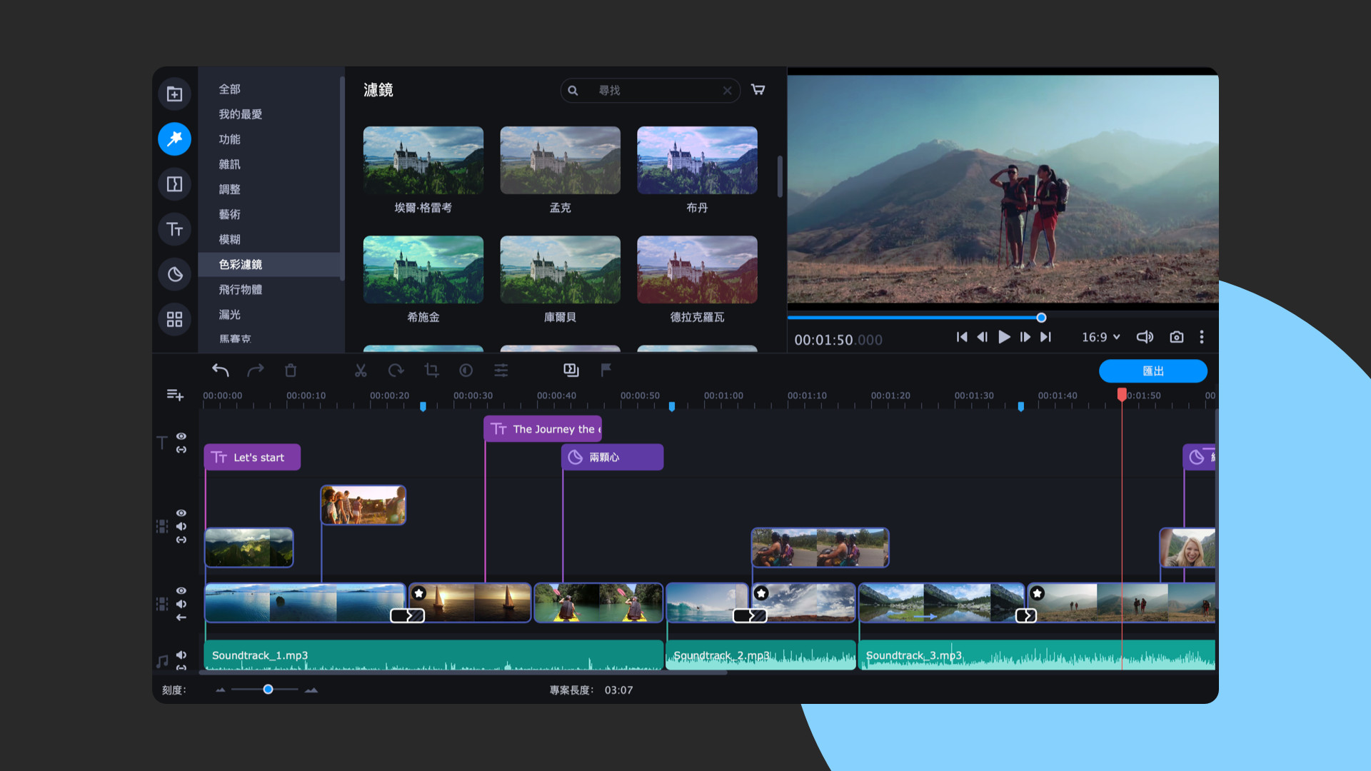 發揮創意,製作出最具吸引力的影音網誌。所需一切,均已俱備。便利的多軌時間軸可用來管理鏡頭,由於本程式非常擅於處理全高清或 4K 影片,您也不用擔心大型檔案。修剪、旋轉和增強片段、使用顏色查找表對影片的顏色進行分級、新增特效 (例如色彩嵌空和實體動畫)、插入貼紙、標誌和標題。裁剪、修剪和同步音訊、音量標準化、調整等化器設定等。