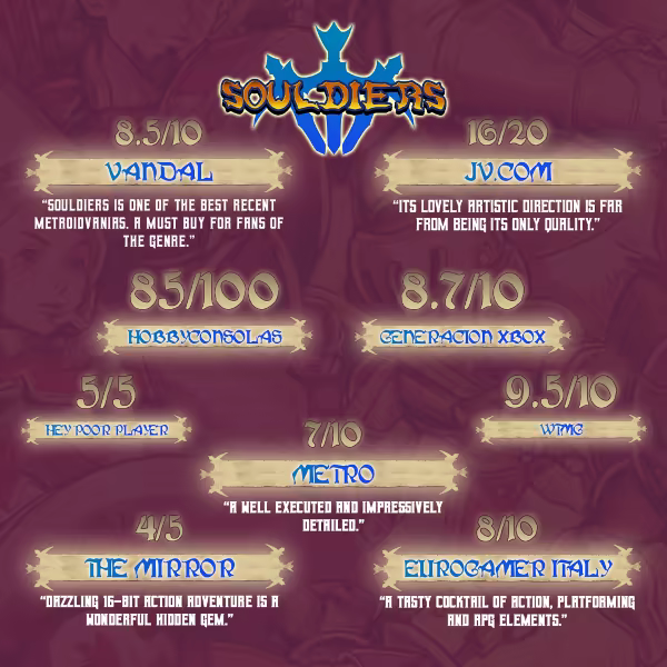“Souldiers is an all-around joyful experience...A genuinely memorable game all metroidvania fans should check out.”
