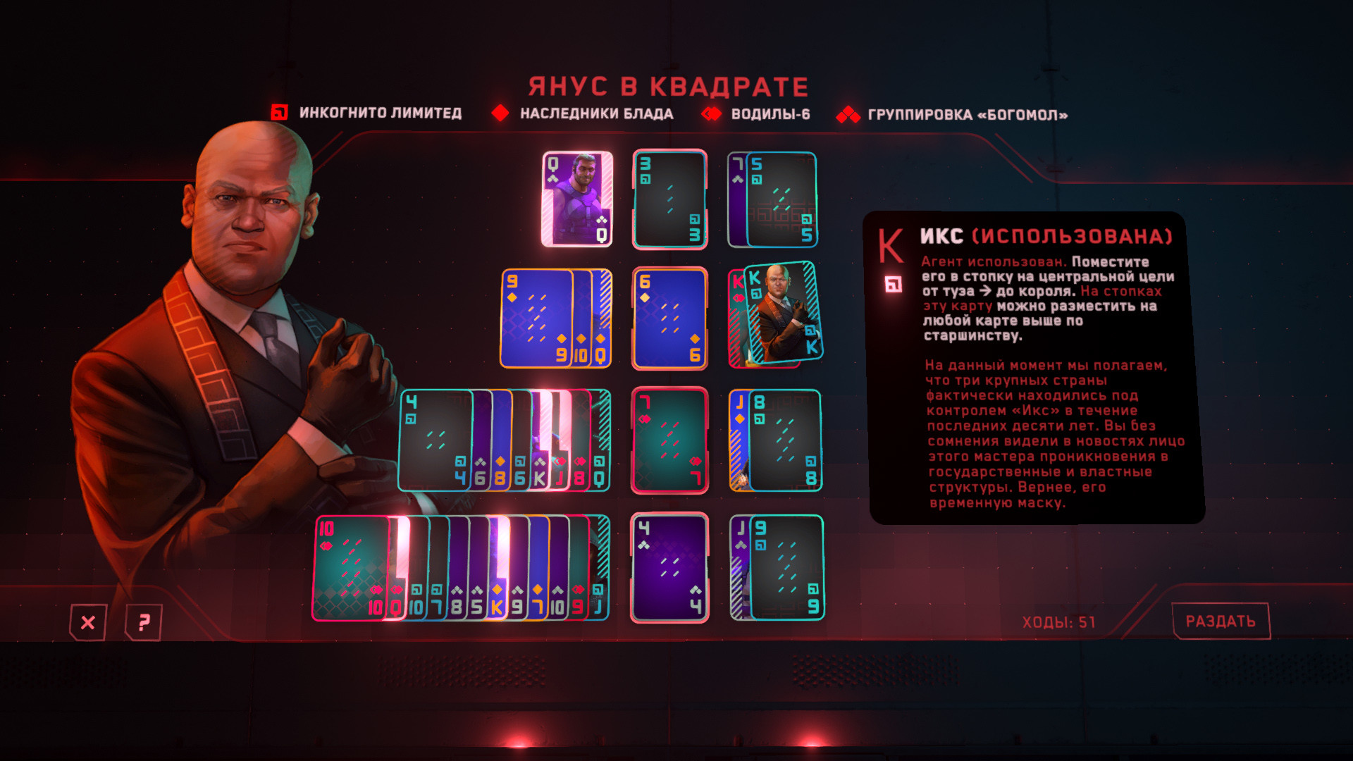 С помощью последнего аналитика Протего Джима Расклада (Грег Миллер) вы освоите уникальные способности каждого отряда в игре тактического пасьянса «Солитер». Так в пасьянс вы еще никогда не играли. Выполните свою миссию и верните все отряды на базу в этой истории, полной обмана и интриг. И помните: никому нельзя доверять. Сохраняйте хладнокровие в мире шпионов ИИ и агентов с киберпримочками.