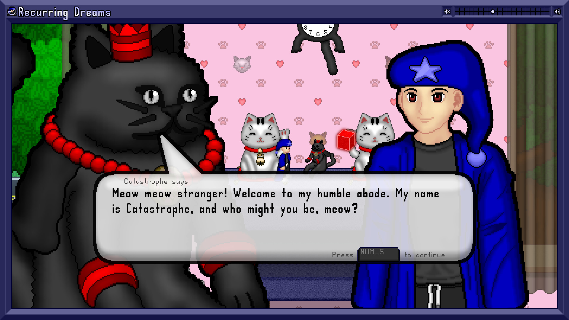 Recurring Dreams tells the tale of a lucid dreamer named Rath, who's trapped in the dreamworld unable to wake up. There he finds a strange power that lets him connect with other dreamers, and he ventures forth to help them with their innermost anxieties while searching for his own path to awakening. Wielding the powers of lucidity, Rath faces off with their recurring nightmares to inspire courage and hope within them. Will he find his way back to reality? Find out by playing!