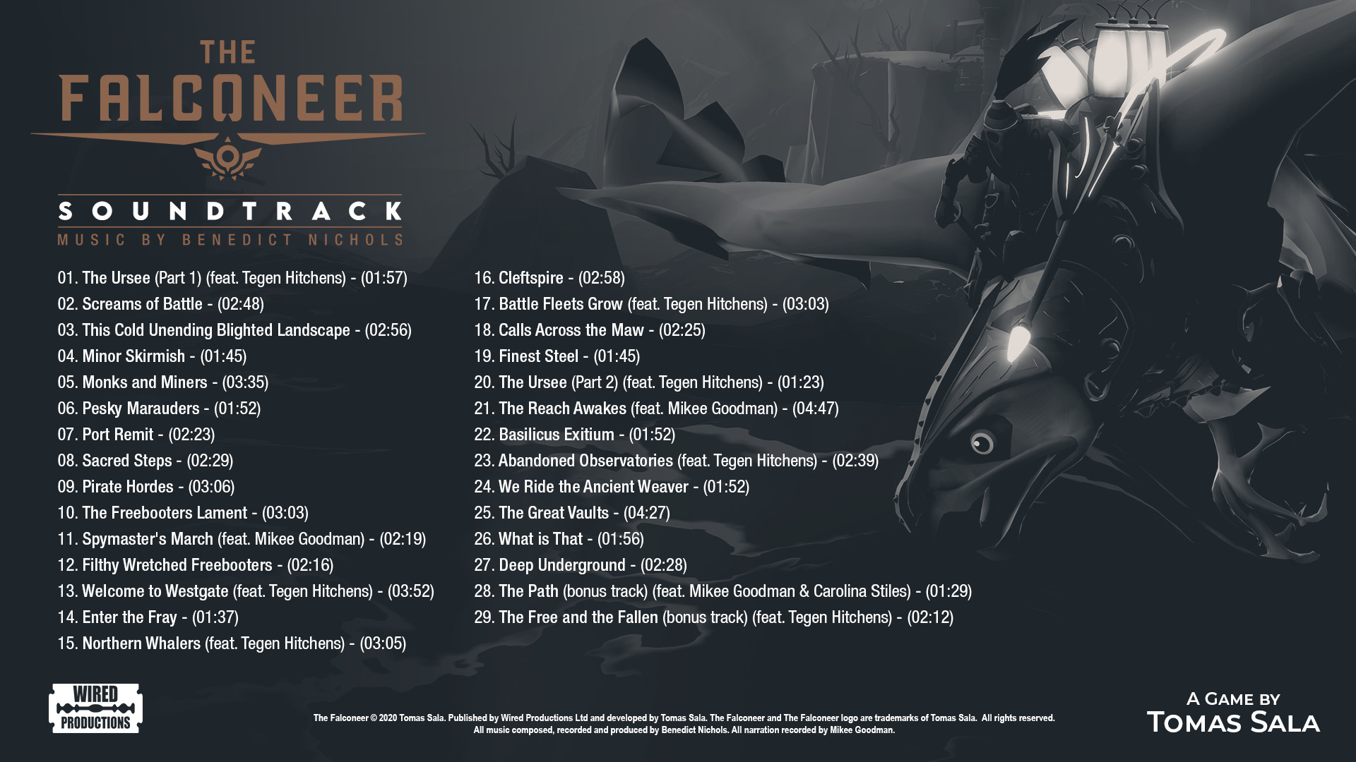 Award-winning composer Benedict Nichols brings together an eclectic soundtrack to invoke the dual nature of The Falconeer; the transcendental waters versus the frenetic and high-energy of aerial combat. From Mongolian throat-singing to razor-edge synthesis and organ, Balkan choirs to bagpipes and cimbalom, experience the sonic world of the mysterious Ursee as factions clash in a fight to preserve the past, or flee its horrible consequences.