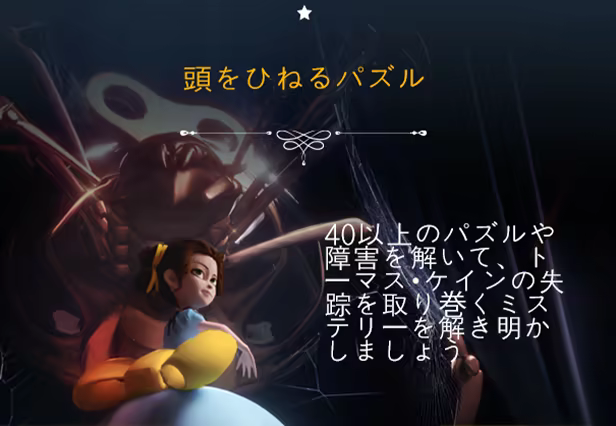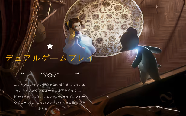 Tandem:影の物語 はトップダウンとサイドスクロールを組み合わせた独創的なシステムと美麗な表現でパズル系プラットフォーマーのジャンルに新機軸を打ち出すゲームです。エマとテディベアのフェントンを助けて、有名な奇術師一族のトーマス・ケインが姿を消した謎を解き明かしましょう。