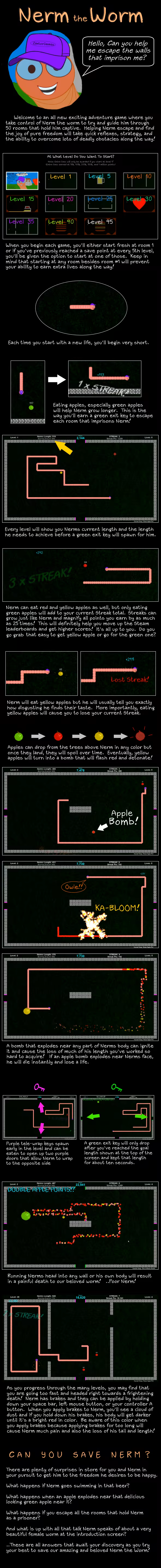 Nerm the Worm was developed from the heart with the goal of offering a brand new super fun-to-play snake game with unique twists & new turns! Nerm presents challenging goals, an adorable personality, and fifty grueling levels to progress through! Nerm just wants to escape! ..Can you help him?