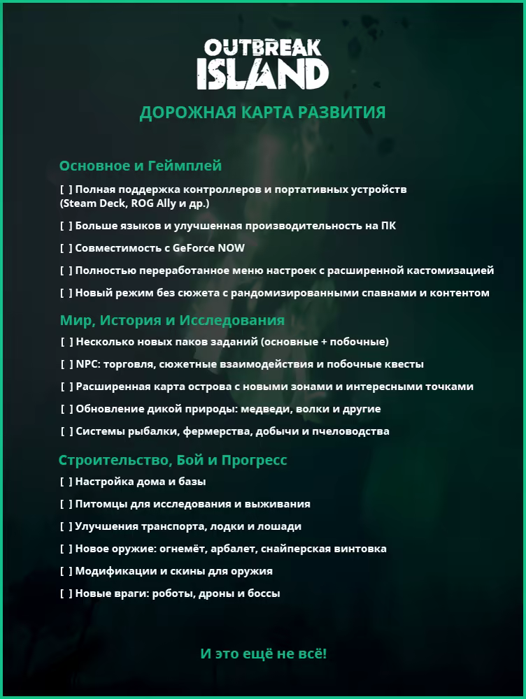Your feedback, ideas, and suggestions help us set priorities and make the game better. I listen closely to players and shape the development of Outbreak Island together with you.»