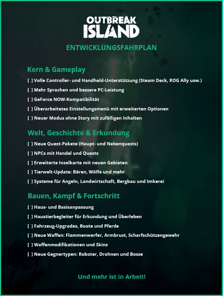 Your feedback, ideas, and suggestions help us set priorities and make the game better. I listen closely to players and shape the development of Outbreak Island together with you.“
