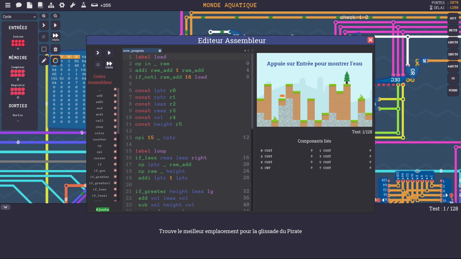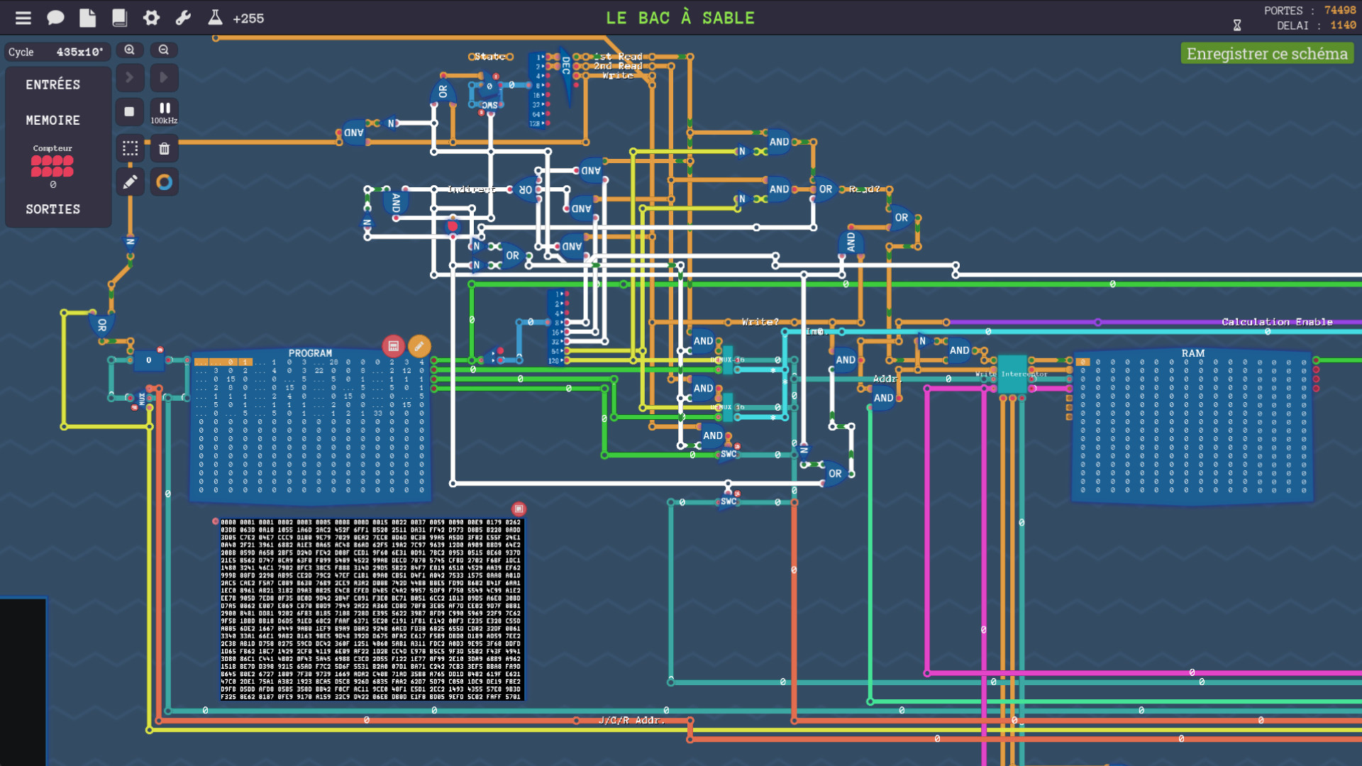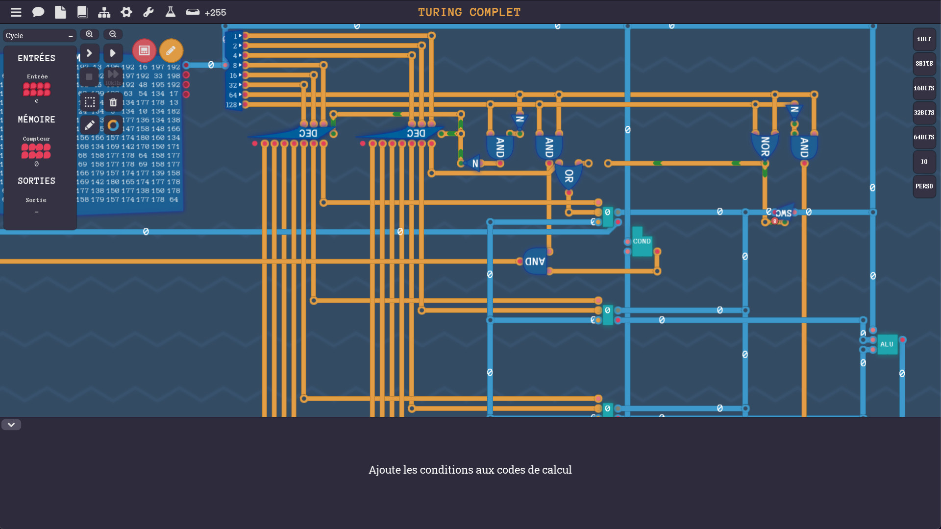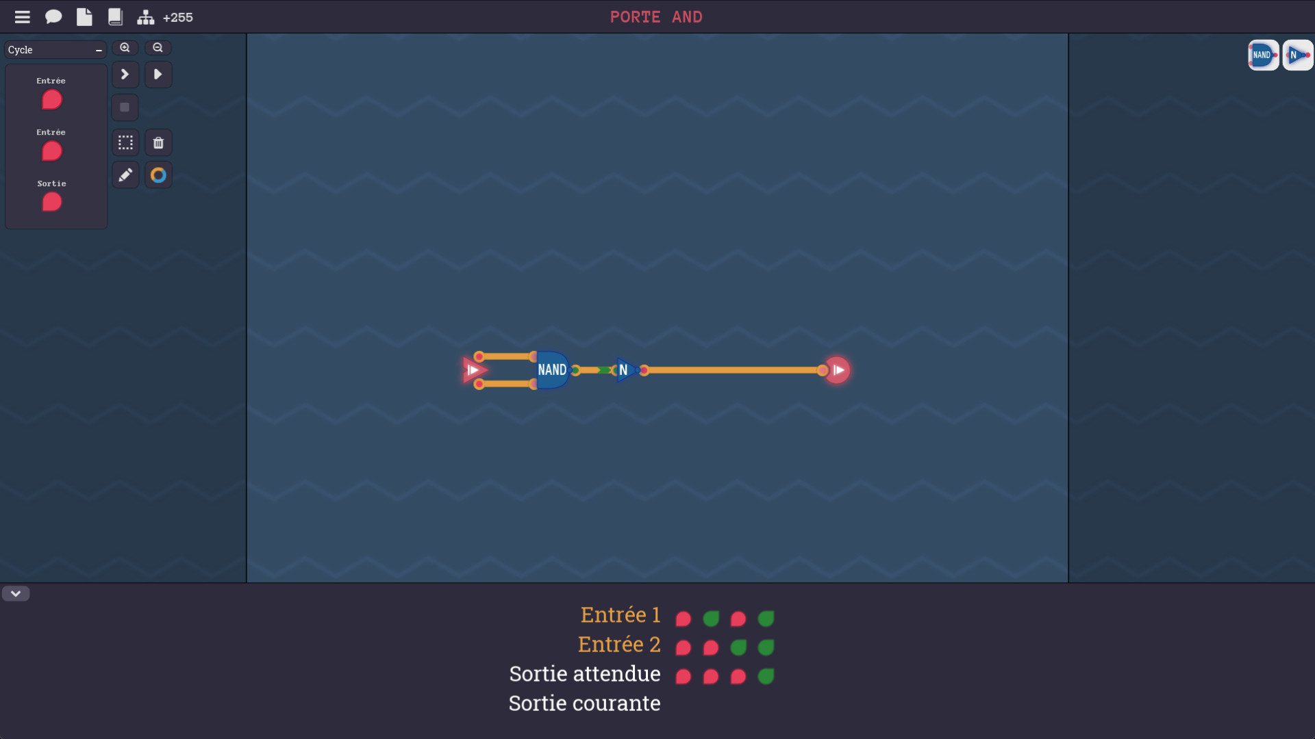 Un ordinateur au complet peut être construit à partir d'un composant de base appelée porte NAND. Tu seras mis au défi à travers une série d'énigmes de découvrir le chemin qui mène des portes NAND aux calculs, aux mémoires et jusqu'aux architectures CPU complètes. Si tu termines ce jeu, tu auras gagné une compréhension approfondie de la façon dont l'assembleur, les jeux d'instructions des CPU et les composants de base sont reliés. Et tu comprendras aussi comment les concepts de programmation tels que les instructions conditionnelles, les boucles et les fonctions s'exécutent en assembleur et avec le matériel.