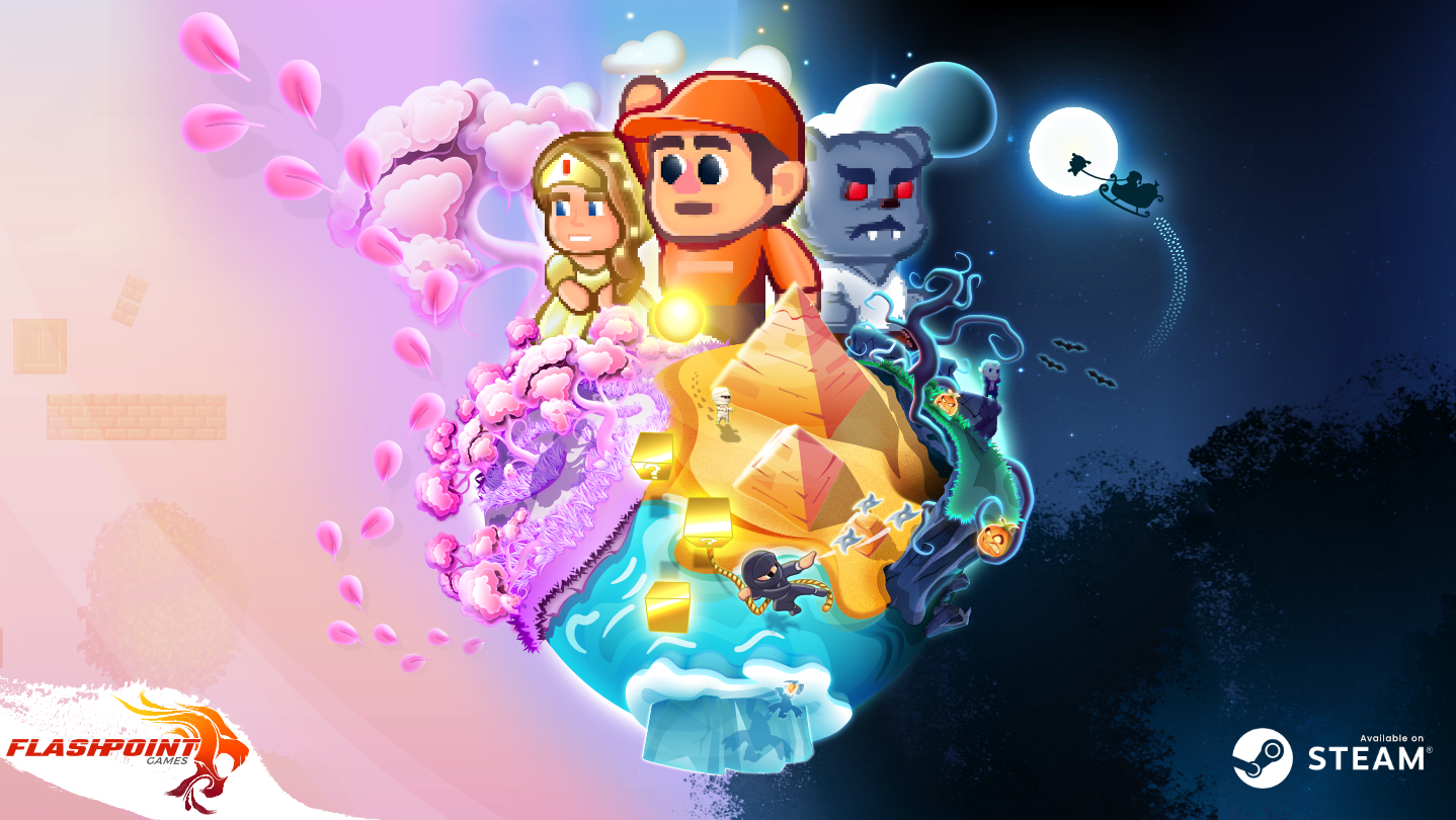Super vs. World is a local multiplayer 2D versus party game that lets up to 8 players combat each other and AI’s with classic platformer headstomping, brick breaking, weapon throwing gameplay!  Choose one of the unique characters and grab a multitude of weapons and power ups to pummel the competition.  Choose from a variety of game modes including Last Man Standing, Kill Count, King of the hill, and Capture the Flag.