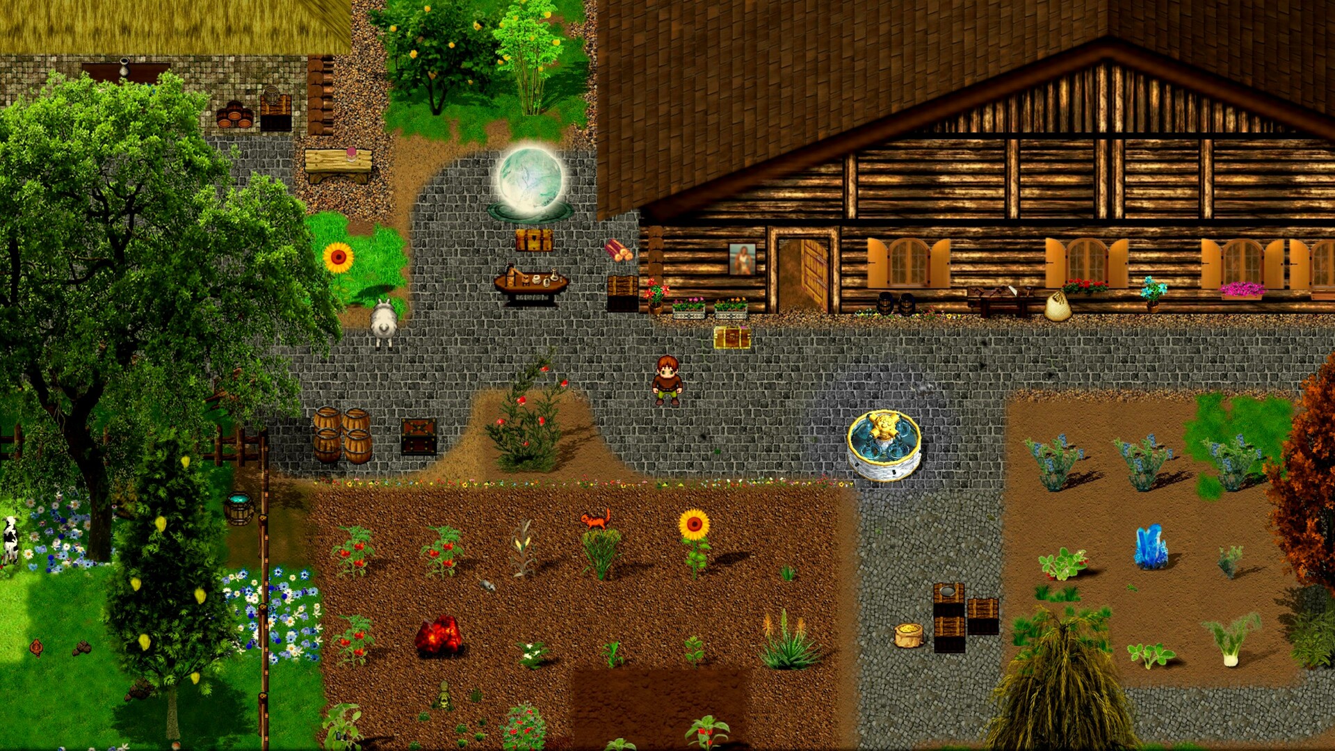For Farming there are many cultivated plants and also ALL wild plants and trees available for cultivation. Animals can be kept in enclosures or stables and small, helping companions are also available. The harvested plants serve on the one hand for own nutrition, for cooking and making magic formulas and on the other hand of course to get the coins to be able to buy stuff from the local traders.