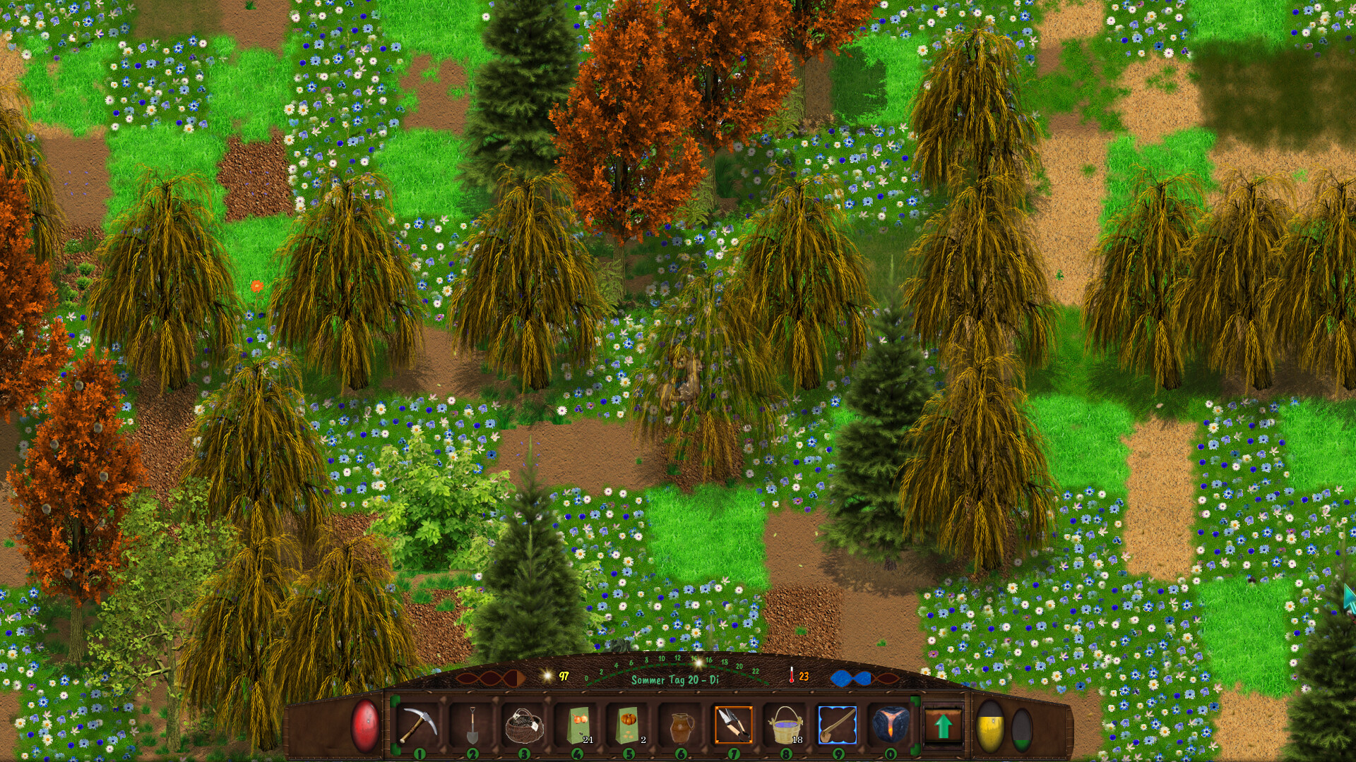 The Nature Simulation makes sure that no game is like the other and that the landscape changes every day. The weather and the seasons are also simulated and have a direct influence on nature and the player, and there are catastrophes and special events in the simulation that can dramatically change the landscape again and again. Plants grow and sow, trees die and give the soil its nutrients. The soil continues to develop and becomes more and more fertile. So the world is constantly changing.