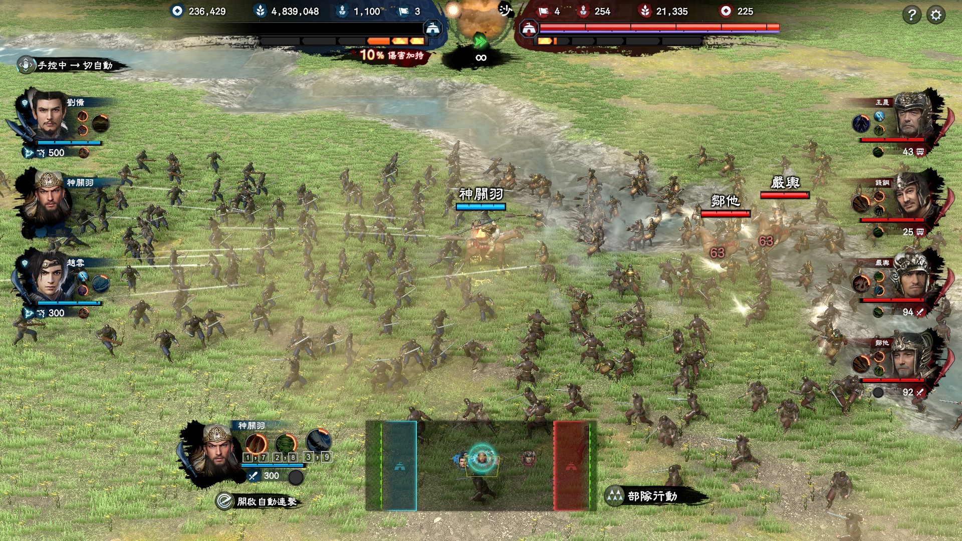 神關羽武將技:水淹七軍——以 (461/474/486/500/513) % 武力對敵方全體造成物理傷害。