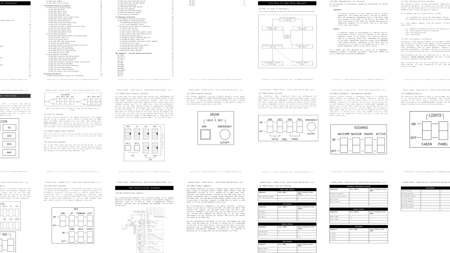 Carefully planned, the Odyssey Spacecraft Operator's Manual (available online and in PDF format, allowing it to be loaded on a second monitor, the Steam Overlay, or any mobile device) has been modeled after actual procedures manuals from Apollo-era craft. The Operator's Manual includes detailed diagrams, a bit of humor, and pre-launch, hazard, and emergency procedures, all done in an authentic 60's, government-funded style!