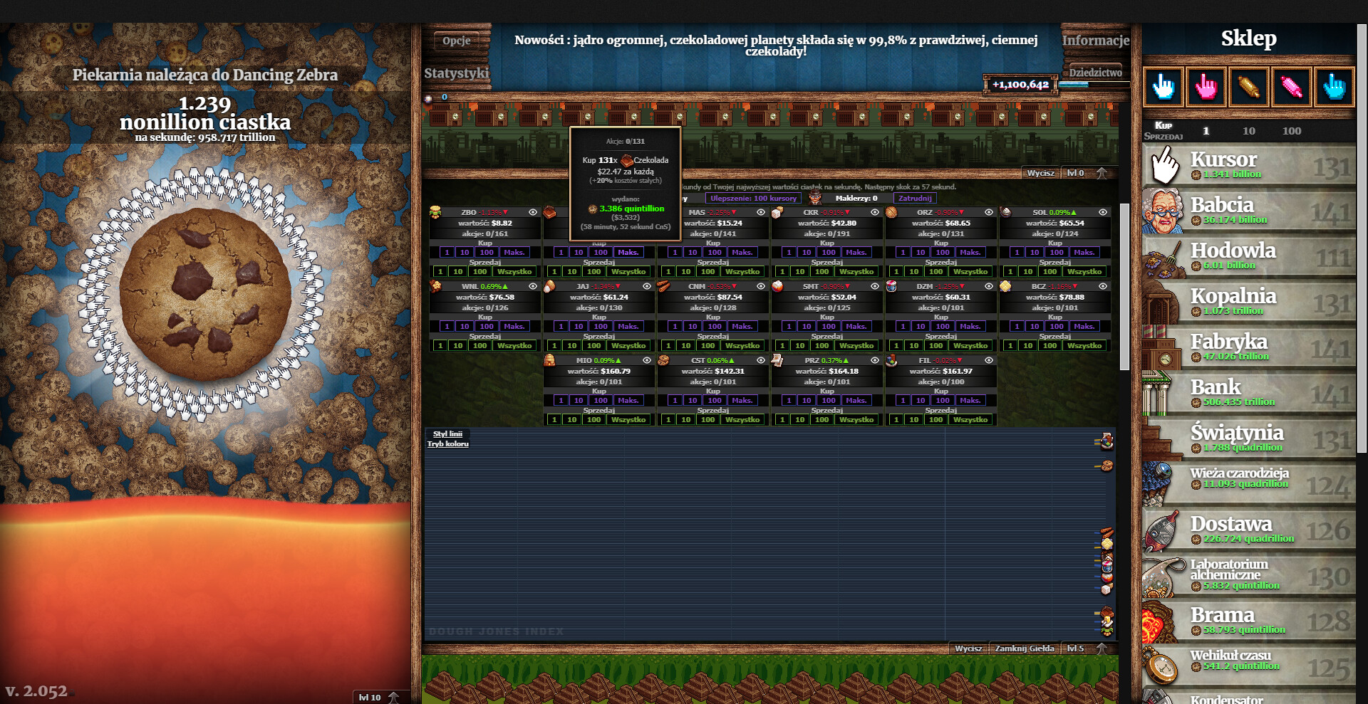 Cookie Clicker to gra o robieniu ciastek w absurdalnych ilościach. W tym przedsięwzięciu, będziesz rekrutować przeróżnych pomocników, takich jak przyjazne Babcie, Farmy, Fabryki i nieziemskie Portale.