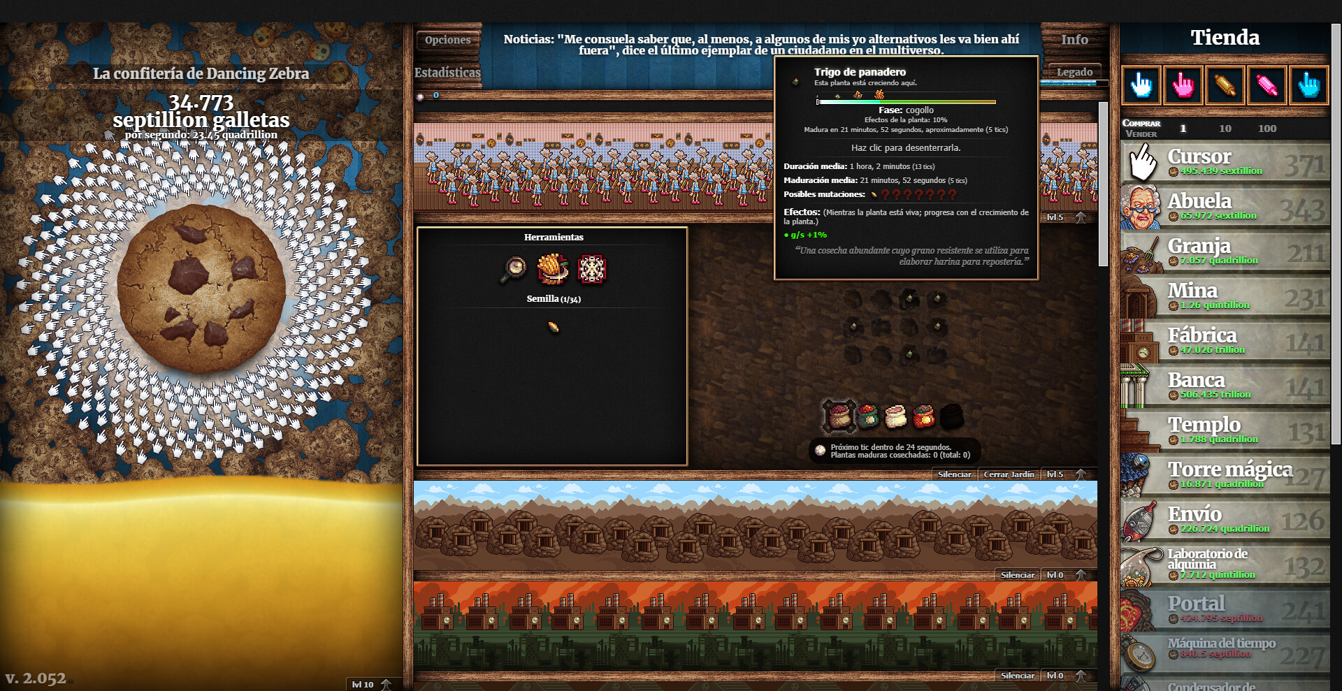 Cookie Clicker es un juego que consiste en hacer una cantidad obscena de galletas. Para ayudarte en esta empresa, reclutarás a una amplia variedad de serviciales fabricantes, como las entrañables abuelas, las granjas, las fábricas y los portales sobrenaturales.