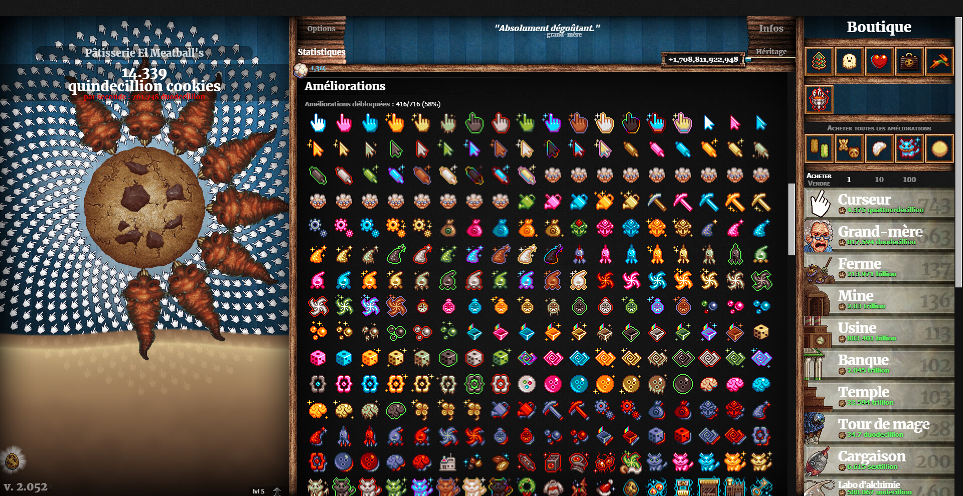 Cookie Clicker a d'abord été publié en 2013, mais a continué d'être développé activement depuis. Si tu y as déjà joué, essaie à nouveau pour profiter de toutes ses nouvelles fonctionnalités !