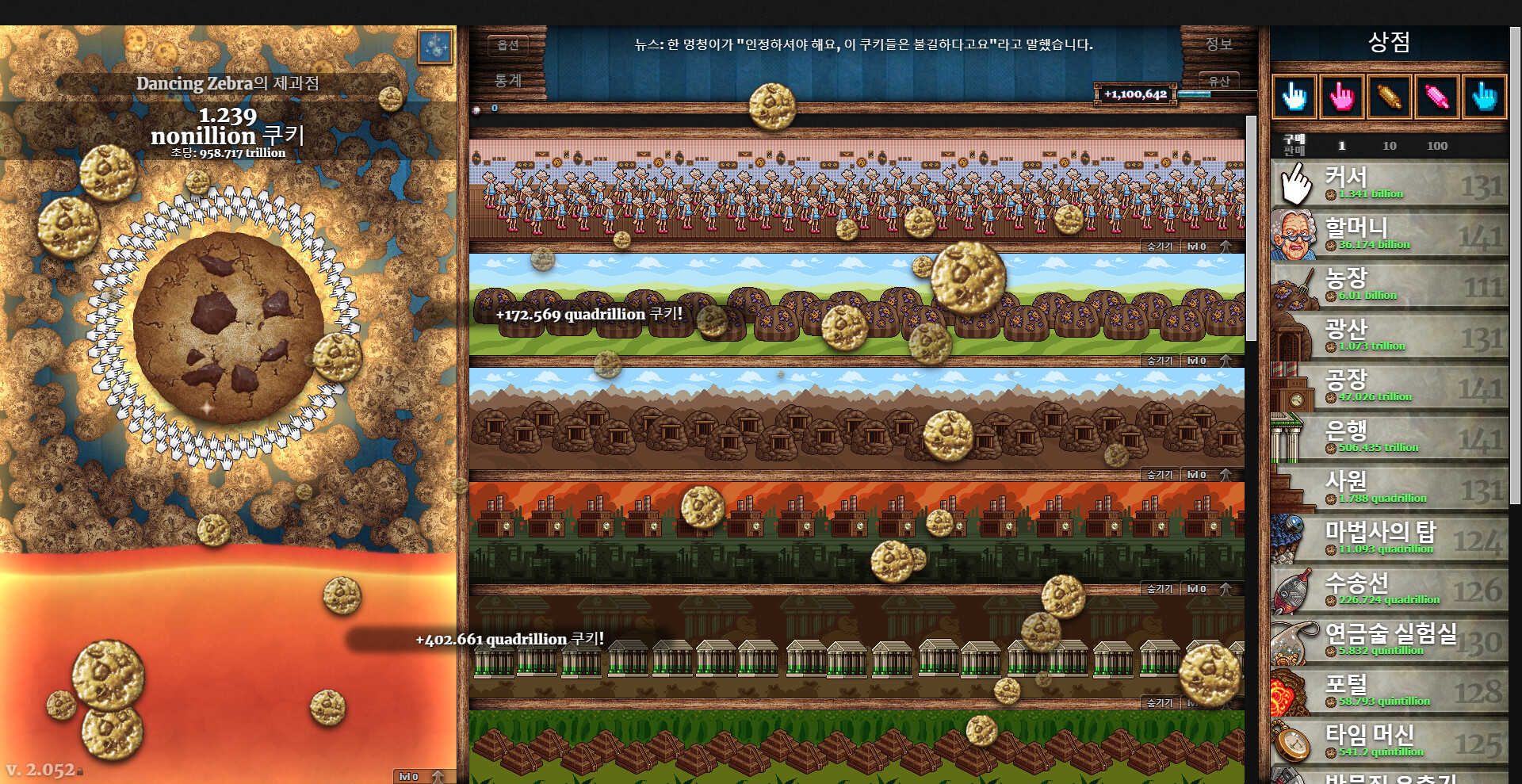 Cookie Clicker는 어마어마한 양의 쿠키를 만드는 게임입니다. 이 목표를 달성하기 위해 친근한 할머니, 농장, 공장, 그리고 이계의 포털 같은 다양한 쿠키 제조자들을 모집할 것입니다.