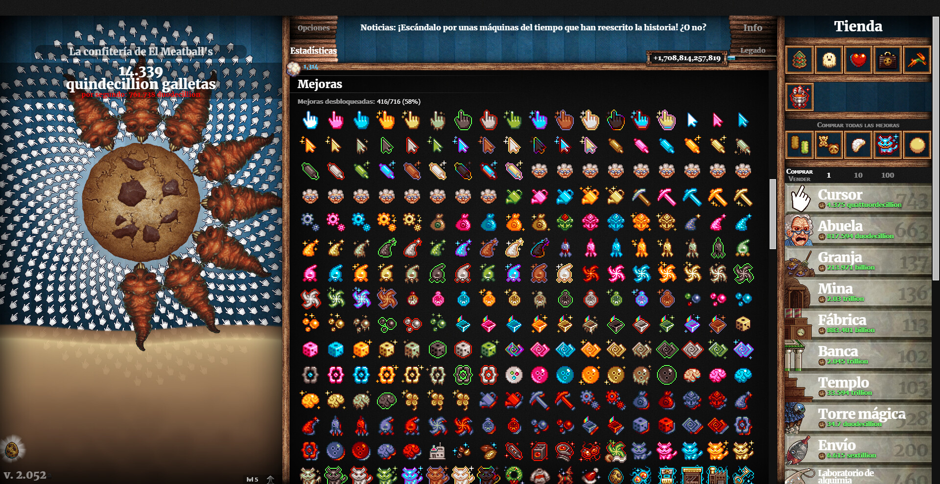 Cookie Clicker es un juego que consiste en hacer una cantidad obscena de galletas. Para ayudarte en esta empresa, reclutarás a una amplia variedad de serviciales fabricantes, como las entrañables abuelas, las granjas, las fábricas y los portales sobrenaturales.