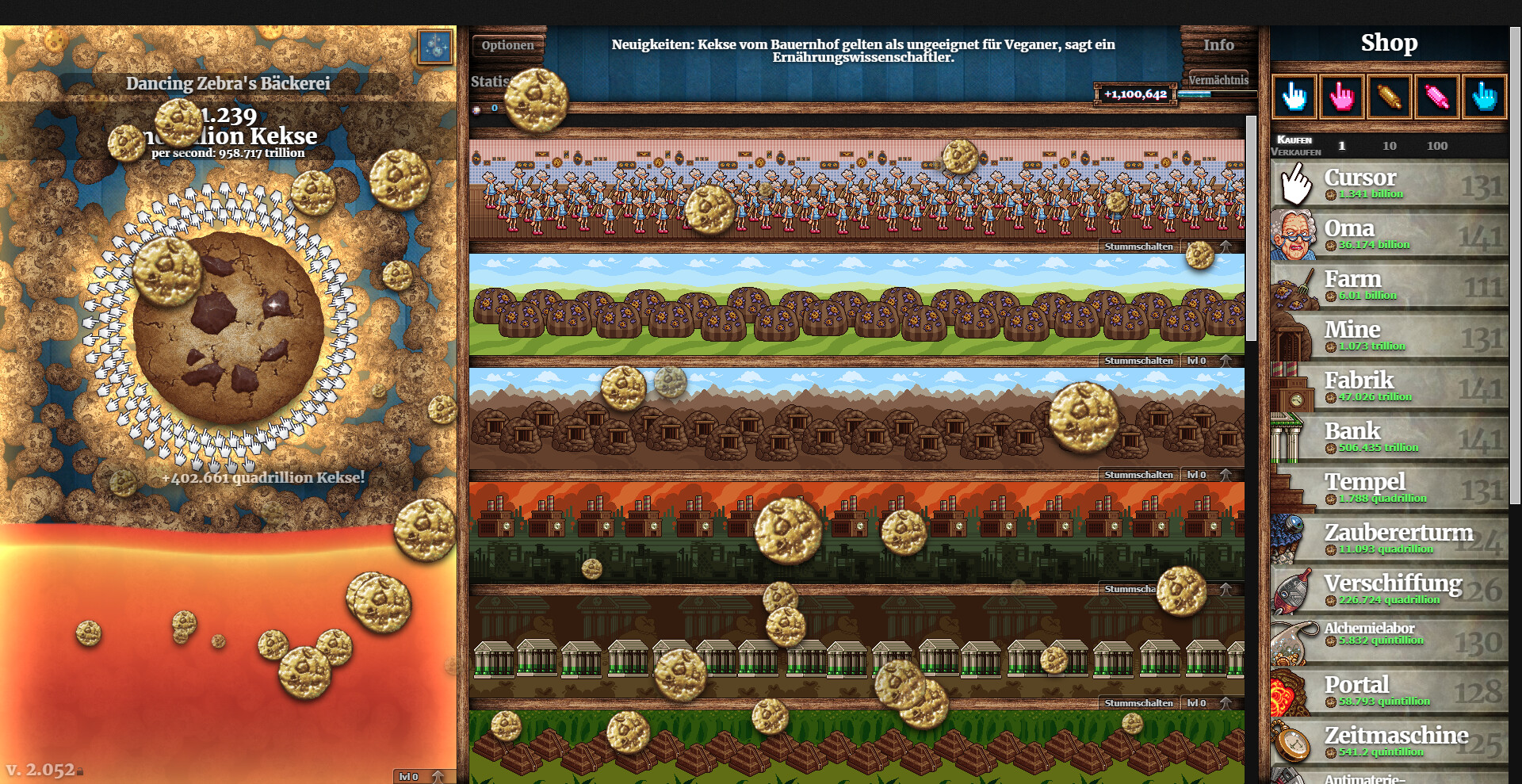 Cookie Clicker ist ein Spiel, in dem es darum geht, eine absurde Menge an Keksen herzustellen. Um dir dabei zu helfen, heuerst du eine Vielzahl von hilfreichen Keksherstellern an, wie freundliche Omas, Bauernhöfe, Fabriken und außerirdische Portale.