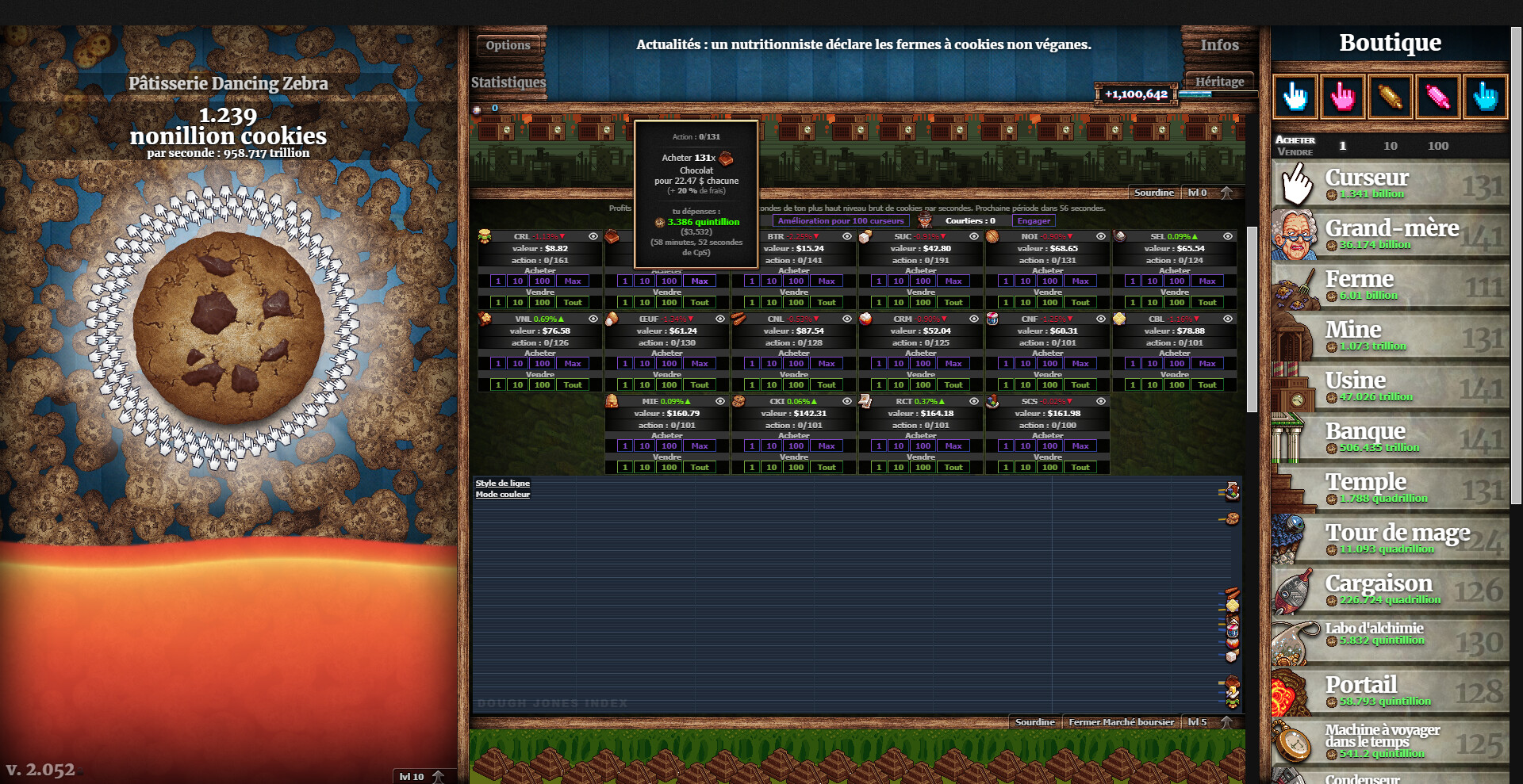 Cookie Clicker est un jeu consistant à produire une quantité absurde de cookies. Pour t'aider dans cette tâche, tu recruteras des confectionneurs de cookies divers et variés, commes des grand-mères adorables, avec des fermes, des usines, ainsi que des portails vers d'autres mondes.
