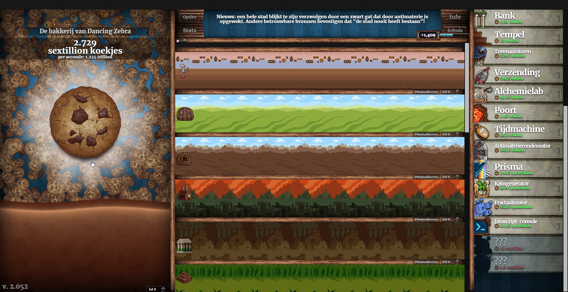 Cookie Clicker werd oorspronkelijk uitgegeven in 2013, maar is sindsdien zeer actief ontwikkeld. Als je het eerder gespeeld hebt, probeer het dan opnieuw om alle nieuwe functies te zien!