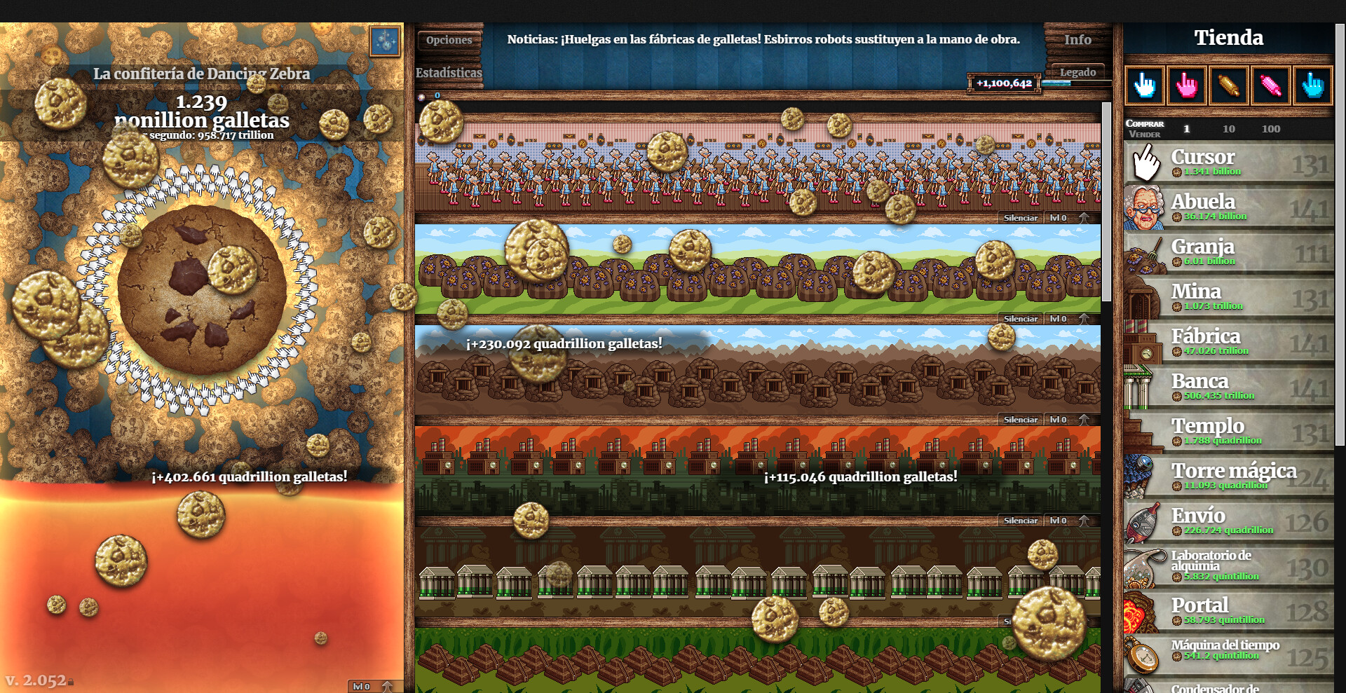 Cookie Clicker es un juego que consiste en hacer una cantidad obscena de galletas. Para ayudarte en esta empresa, reclutarás a una amplia variedad de serviciales fabricantes, como las entrañables abuelas, las granjas, las fábricas y los portales sobrenaturales.