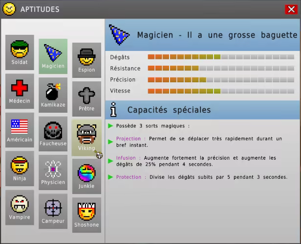 Médecin, Soldat ? C'est has-been mais ils sont intégrés pour faire genre. Nul doute que tu préfèreras être un Kamikaze pour te faire exploser et emporter tous les ennemis autours de toi ou encore un Magicien pour lancer des sorts !