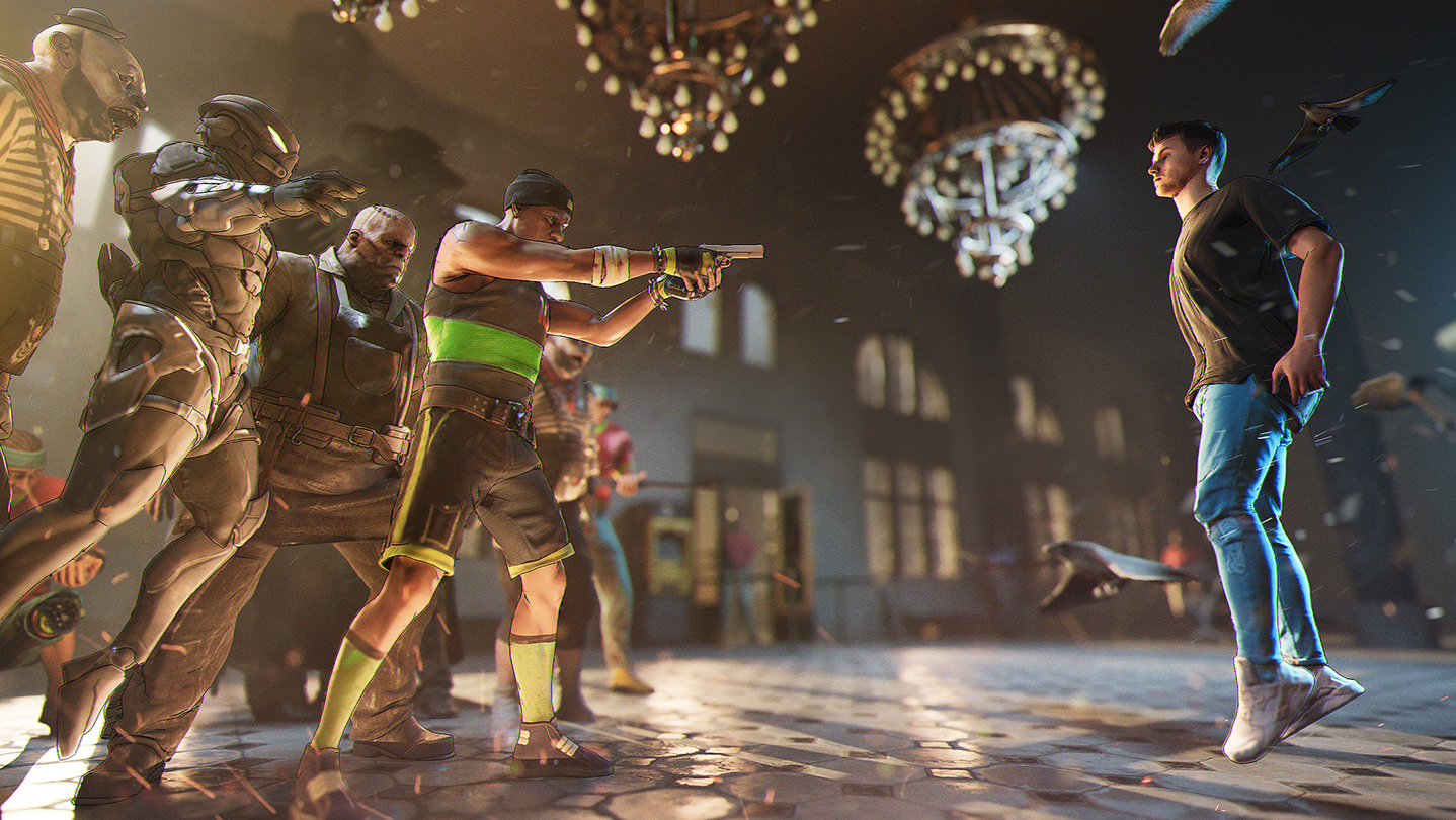 Some stages of the game depict gun violence in the form of firearm use in combat between adult characters.