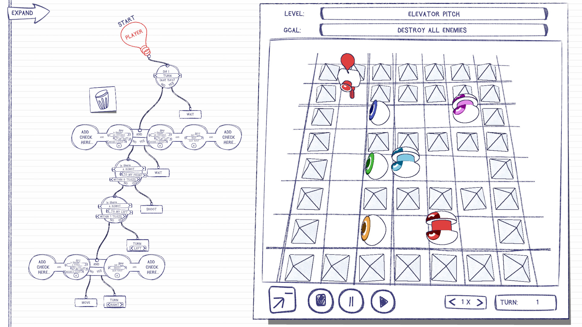 If you fail at first, there's a detailed overview of what decisions he's made and you can easily pinpoint where it all went wrong. After all, what is programming other than iterating through solutions, getting closer and closer with each step, until that wonderful moment at the end when you clench your fist with pride after a successful run and take your well earned walk around the room to show everyone just how clever you really are. This is how Sketchbots will help you feel with each completed level, all while enjoying its beautiful, school-notebook-inspired, art design.