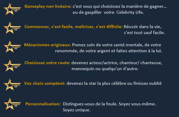 Celebrity Life vous permet de mener la vie de la personne que vous avez probablement toujours rêvé d'être. Réalisez vos rêves et essayez de devenir une célébrité internationale. Gagnez de l'argent et claquez-le dans des produits de luxe. Chouchoutez vos fans et battez vos rivaux. Arrivez au sommet de la gloire. Mais attention. La célébrité, c'est aussi des responsabilités, un travail acharné et des choix difficiles. La chute n'est souvent qu'à un pas.