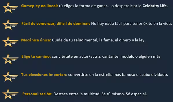 Celebrity Life te ofrece la oportunidad de experimentar la vida de esa persona que probablemente siempre quisiste ser. Haz realidad tus sueños e intenta convertirte en una celebridad mundialmente conocida. Gana dinero y púlelo comprando cosas de lujo. Cuida de tus seguidores y lucha contra los rivales. Escala al tope de la fama. Pero ten cuidado con la fama, conlleva responsabilidad, trabajo duro y decisiones difíciles. La caída suele estar a un solo paso.