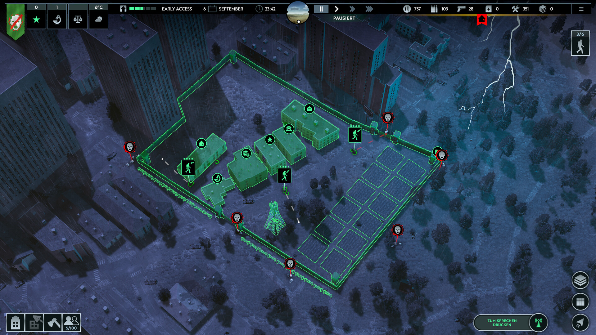 Errichte eine neue „Infektionsfreie Zone“ an einem Ort deiner Wahl. Richte Notunterkünfte und Produktionsstätten ein. Passe vorhandene Gebäude an neu entstehende Bedürfnisse an. Baue neue Farmen und Kraftwerke. Lege Verteidigungsanlagen mit Mauern, Toren und Türmen an.
