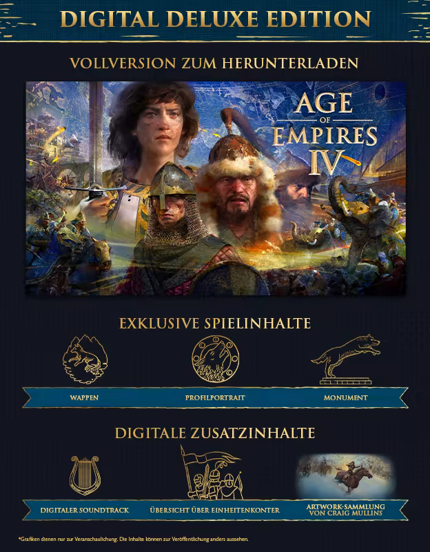 Die Digital Deluxe Edition umfasst alle Inhalte für Age of Empires IV sowie zusätzliche digitale Bonusinhalte wie den offiziellen Soundtrack für Age of Empires IV, eine anschauliche Tabelle für Einheitenkonter, ein digitales Gemälde des Künstlers Craig Mullins sowie exklusive Spielinhalte, darunter ein besonderes Wappen, Spielerprofil und Monument.