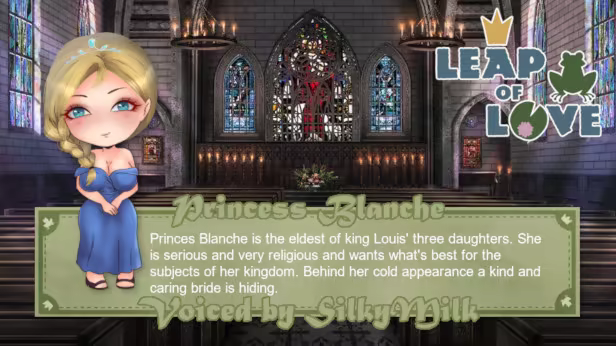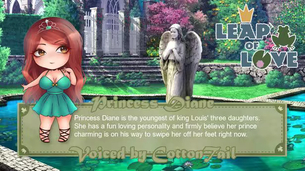 Leap of Love is a fantasy game where you play as Kaheroux a frog turned prince by a shady wizard. The catch of that spell is that he needs to find and marry a princess within a month or go back to being a frog.