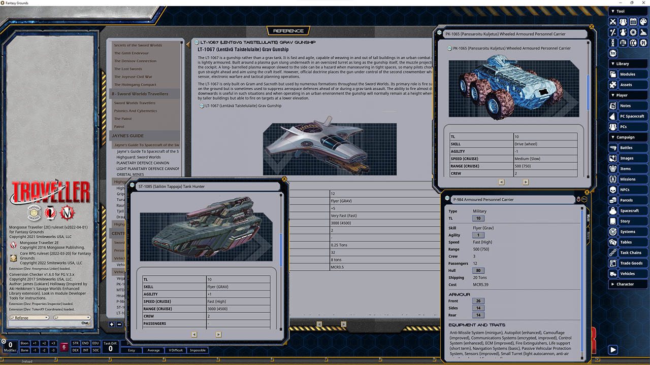Requires: The free Fantasy Grounds virtual tabletop (VTT) software and a one time purchase of the Traveller 2E (Mongoose) ruleset.