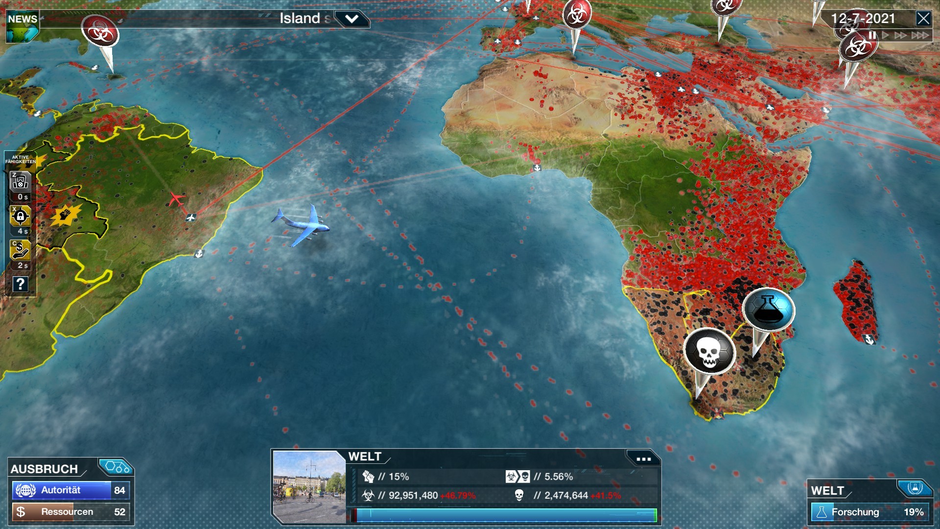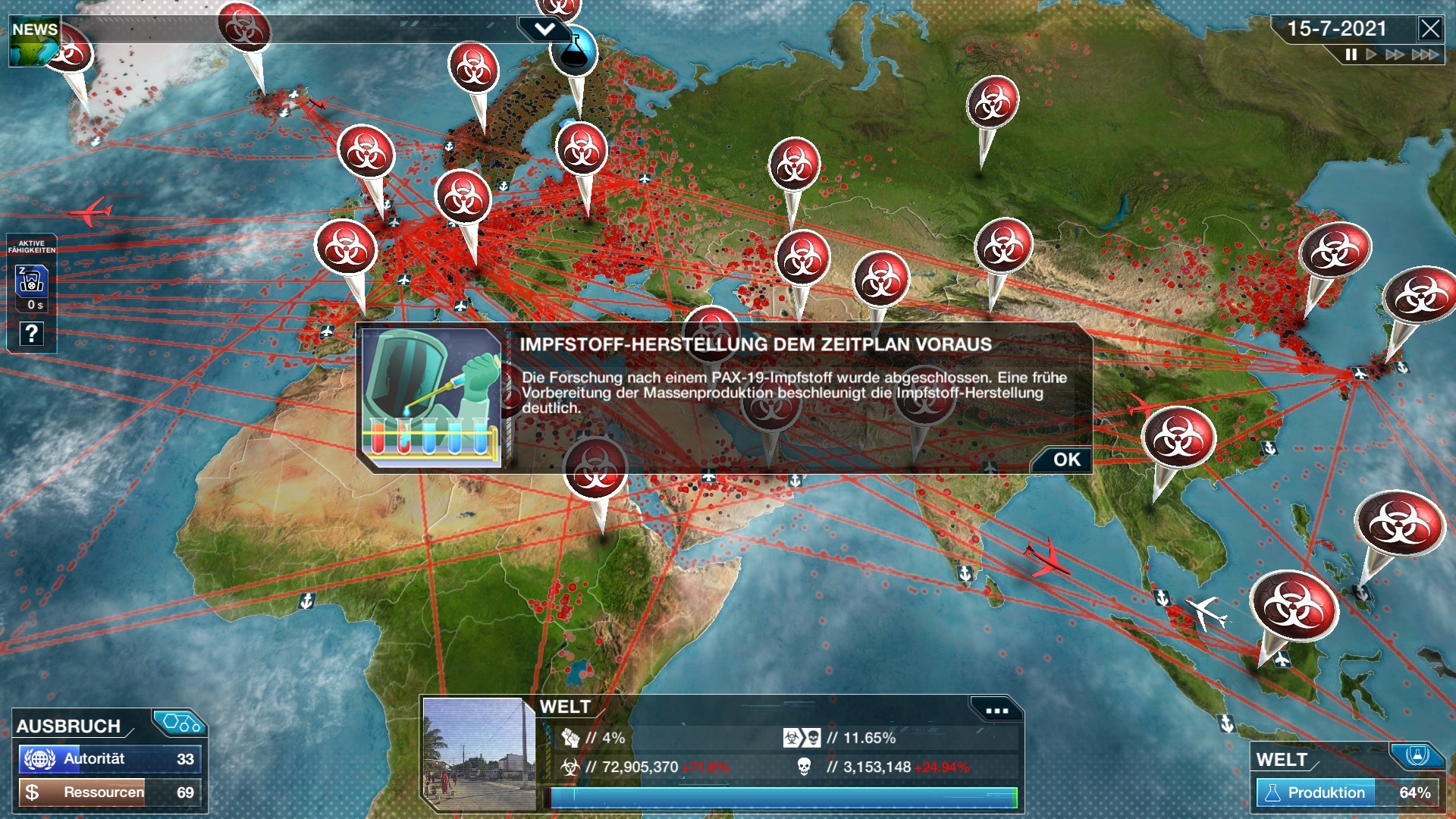 Entwickle einen Impfstoff: Erforsche, produziere und verteile einen Impfstoff, um die Krankheit aufzuhalten. Achte dabei auf eine möglichst effektive internationale Zusammenarbeit, um die Entwicklung zu beschleunigen.
