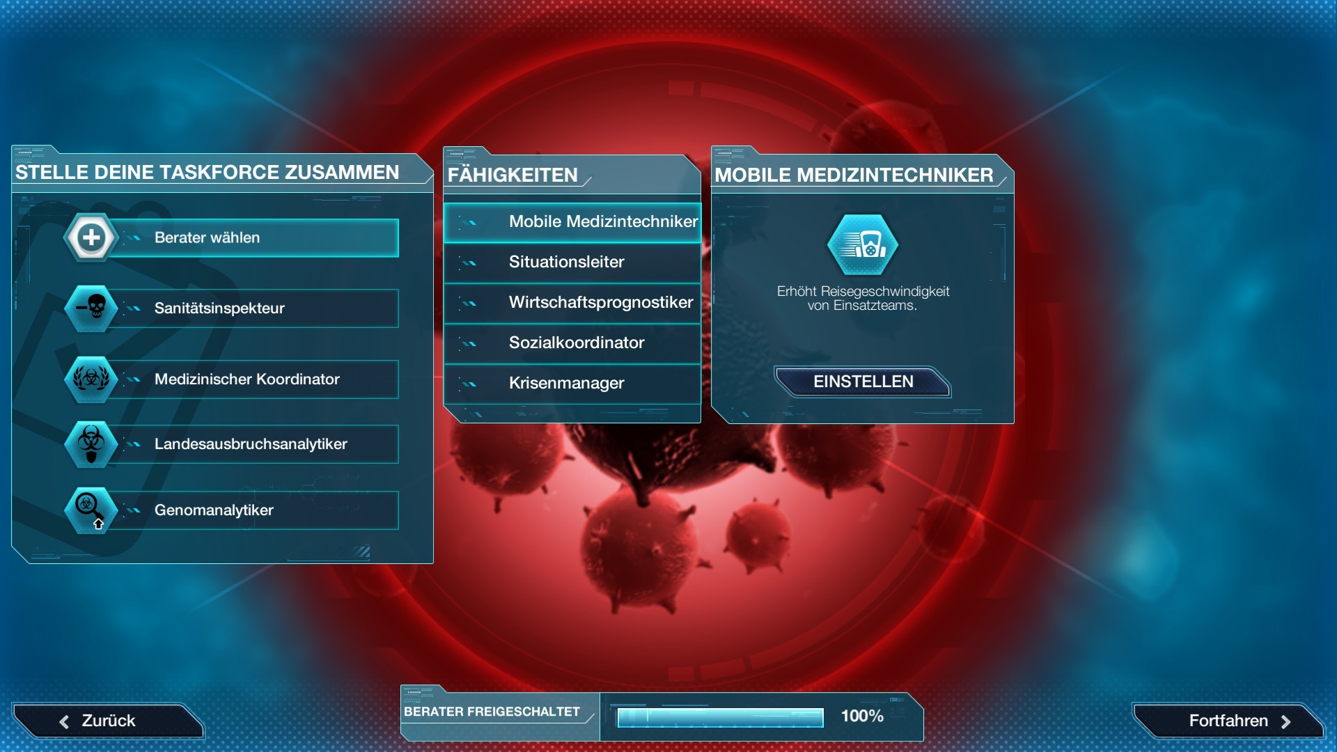 Mach Jagd auf die Krankheit: Schicke Forschungsteams los, um Patient null zu finden, verfolge die Ausbreitung der Krankheit und unterstütze lokale Gegenmaßnahmen.
