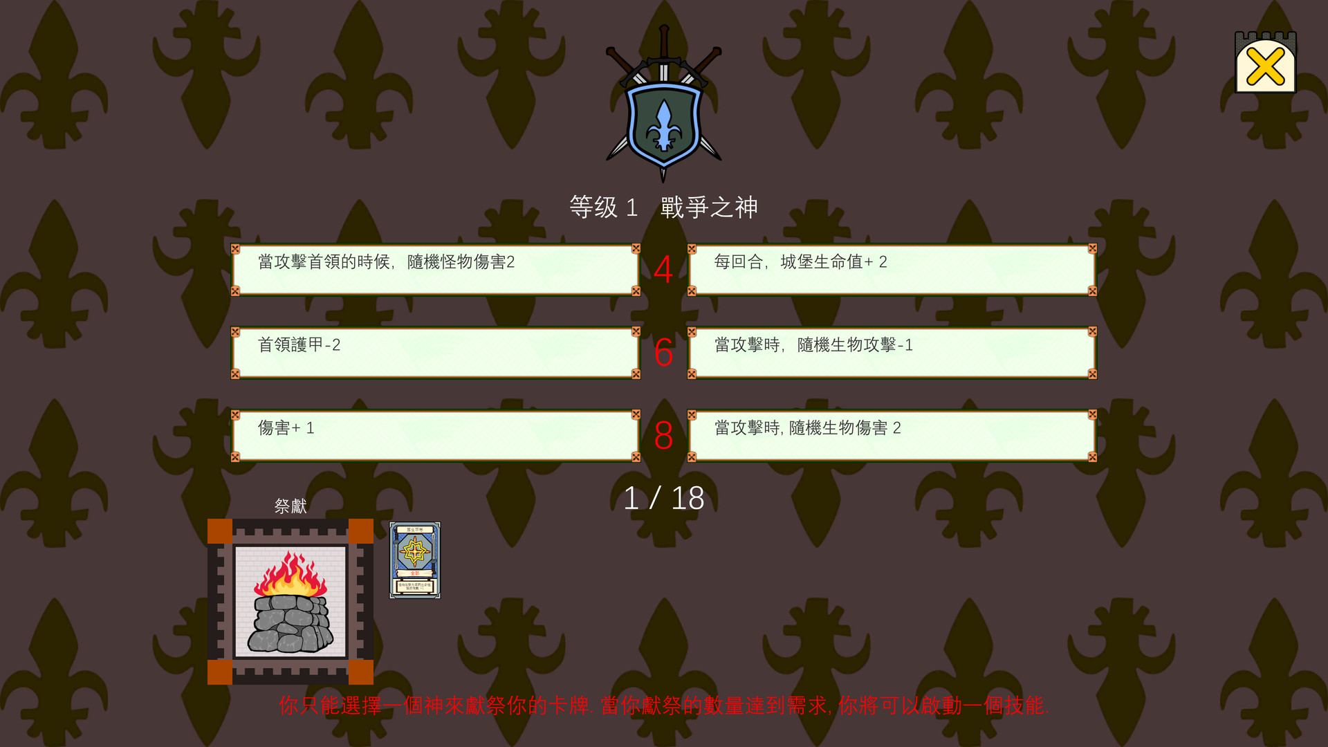 • 神[/]:選擇其中一個神,犧牲你的卡牌獲得技能。