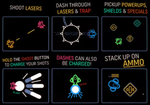 Controls: This is a multiplayer game, and controllers are recommended. Your ship can move, shoot and dash! Hold shoot or dash to charge your attacks.