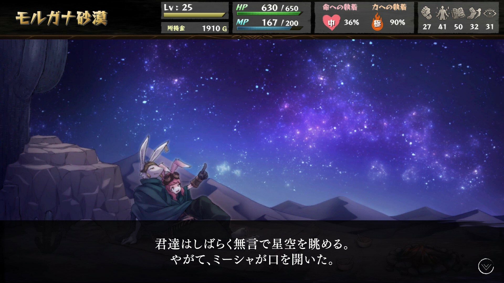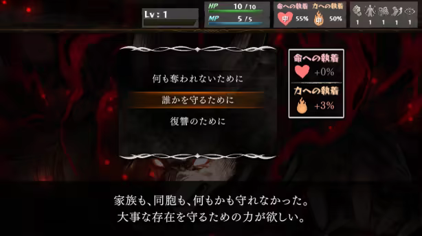 このゲームでは、プレイヤーの選択によって主人公の「執着」が変動し、考え方が変わっていきます。