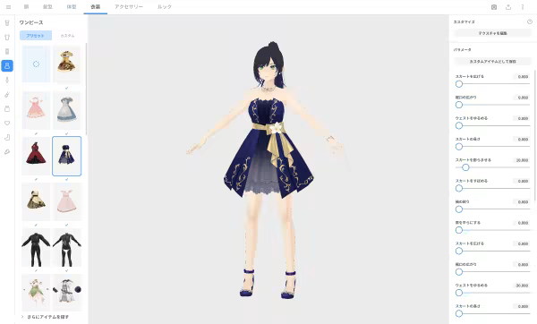 顔・体・髪型・衣装の形・大きさ・長さなどを個別に設定できるパラメータを多数用意。パラメータを調整するだけであなたの思い描く3Dキャラクターをつくることができます。