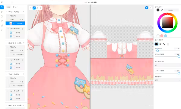 3Dモデルの瞳や衣装に対して、プレビューしながらリアルタイムに直接テクスチャを描き込んで制作することができます。(3DモデルとUV展開どちらにも描き込みが可能)テクスチャ編集機能はペンツールの筆圧感知に対応、レイヤー分け機能も搭載されています。
