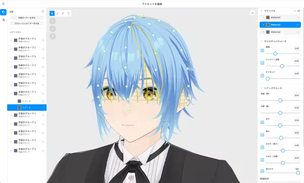 ペンツールで毛束を描き、各種パラメーターを調整するだけで、簡単にキャラクターの髪型をモデリングすることができます。髪を揺らすための「ボーン」も手軽に設定可能です。
