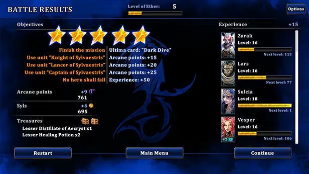 Start with the heroine Vesper and win new allied units with unique abilities. Level up your characters, unlock new skills (active and passive abilities), and upgrade them.