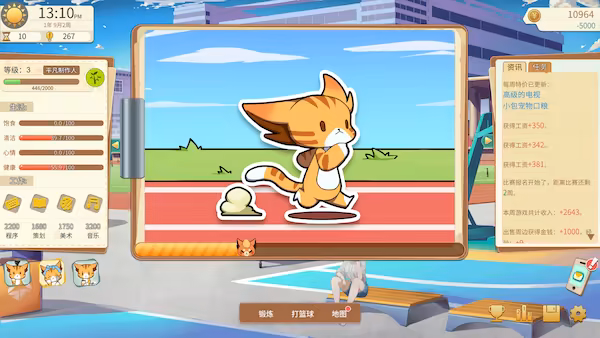 作为一个独立游戏开发者,你需要维持饱食、清洁、心情、健康等四个状态属性,通过点外卖饱食回复饱食、玩游戏改变心情、洗澡恢复清洁度,同时还需要出门通过跑步、打篮球来保持健康的身体。
