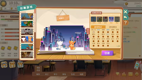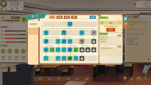 只有平衡各项身体指标,才能够有更好的状态去学习提升编程、策略、美术、音乐等各项能力。随着能力的解锁,能够开发的游戏作品类型也变将变得更加丰富,甚至打造一款广受好评的3A大作也成为可能。