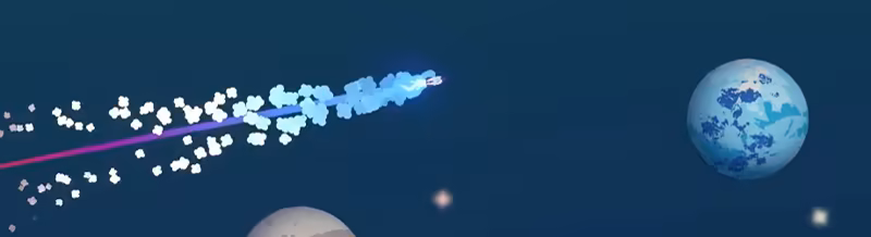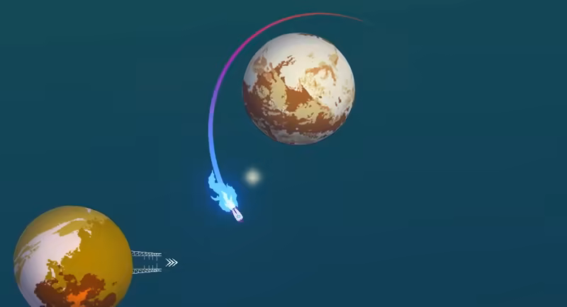 When releasing [SPACE], the gravity engine is turned off. The rocket will be captured by the planets and fly in a curved orbit. Use this method to rotate your rocket and adjust the trajectory!