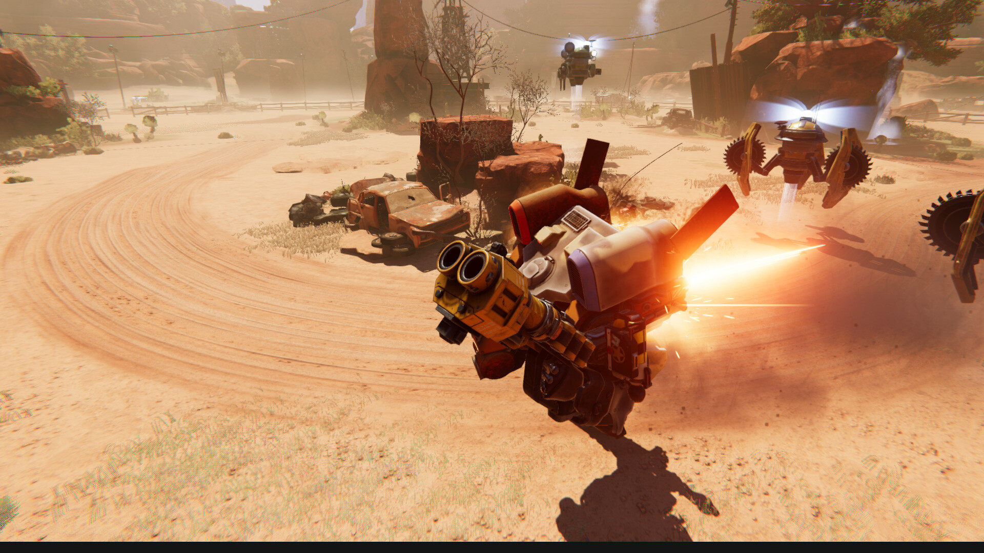 You pilot the Desert Raptor MKII, a Mech of extraordinary power. It is a highly-customizable battle vehicle that can be equipped with a variety of offensive systems: heavy, high-powered melee weapons, steam powered hydraulic siege weapons, explosive firearms, and more. It can also be equipped with a variety of defensive systems; high-speed thrusters, boosters for dashing, riot shields, among others.