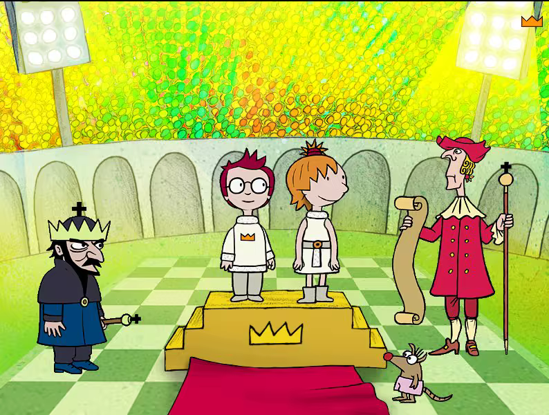 On their journey they are joined by Kalaidoscope, a jolly instructor, who tells them all about the kingdom. In each scene the children can click different elements, like the mouse traps in the above picture, funny things happen. It encourages the young users to explore the scenery.